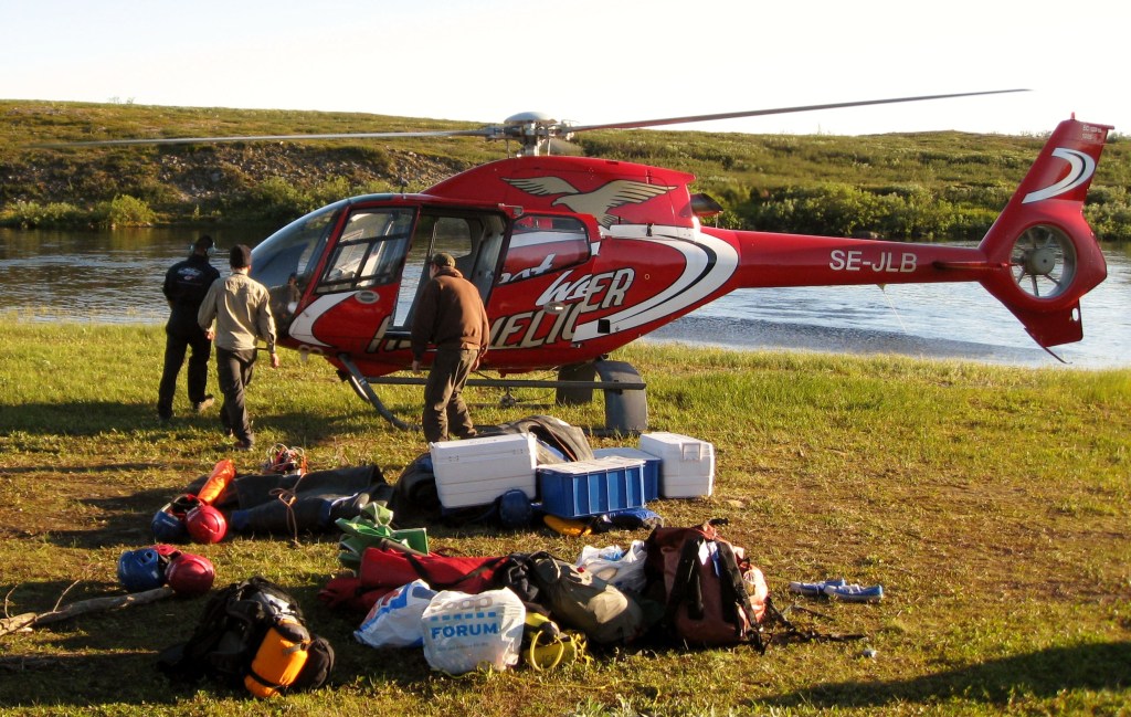 Ankommer sidst på eftermiddagen med helikopter til campen. Første hold er allerede i gang med fiskeriet og har taget de første fisk, mens de ventede på de sidste af os. Vi får alt grejet slæbt ned fra bakketoppen og helikopteren kommer med det sidste læs udstyr på Kiruna. Campen bliver slået op og fiskeriet kan for alvor begynde.