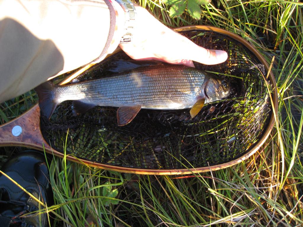 Jeg påbegynder fiskeriet 10 meter nedstrøms campen lige før en lille å løber ud i elven. En plads der uundgåeligt må holde på masser af fisk. Starter med lidt tørflue fiskeri, men vandet er for barskt og jeg tror ikke rigtig på fiskeriet. Dette er altid et godt tegn til at skifte taktik. Jeg skifter derfor over til en lille nymfe med gummi-ben str. 12 og fortsætter fiskeriet. Jeg skal hel ned på den anden side af udløbet i en godt mendet halvt-opstrøms kast før jeg får den første fisk på krogen. Fisken kæmper som en gal og jeg får første smag på en Lainio stalling.
