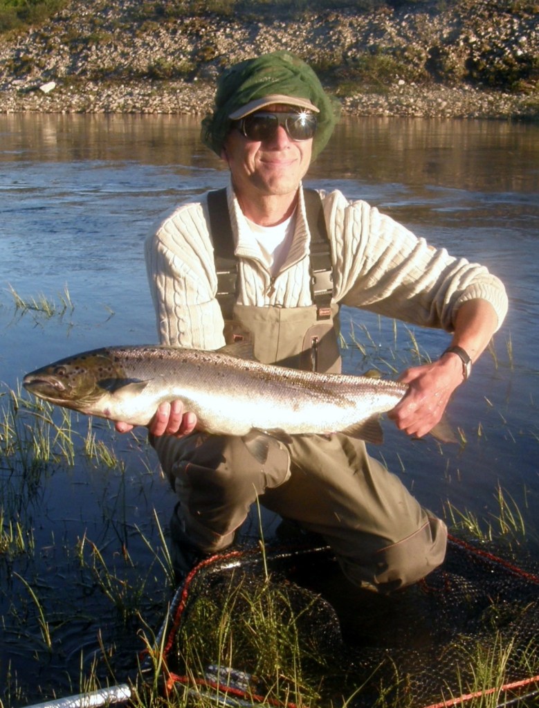 Første tur nedover svinget giver ikke noget. Vi starter forfra, det kan simpelthen ikke passe. Jeg går nu forrest , så Håkan og til sidst er Peter helt bagerst. Midvejs igennem højre jeg pludselig Håkan råbe: Fisk! Hurtigt bliver linen kørt ind og jeg går hen til Håkan. Da jeg kommer tæt på siger han at ”Den er inte stor” men hent lige nettet alligevel. Det gør jeg. Nettet skal siges er et stort karpenet i størrelse xl. Da jeg kommer tilbage med nettet viser fisken sig for første gang. Vi ser kun halen, men størrelsen på halen siger alt. Den er ganske simpelt helt enorm. Håkan ændre pludselig holdning og ordre flyver til højre og venstre. Peter og jeg gør vores bedste for at følge med. Laksen kæmper bravt, men det lader til at den er ved at give op. Den kommer tæt på land, jeg hopper i elven et stykke nedstrøms og Håkan forsøger at drive fisken ned mod mig og det ventene net. Jeg ser endelig fisken tæt på og jeg bliver pludselig nervøs for om fisken overhovedet kan være i nettet. Det når jeg ikke at finde ud af for fisken ser mig og så tager fanden ved den. Den flår line af hjulet og styrter nedstrøms, tilbage mod havet. Håkan sprinter efter over stok og sten. Manden skal siges, løber lige hurtigt i vand som på land så han kan fint følge med, men man kan se på ham at han er nervøs for at miste fisken i et af dens voldsomme udløb. Fisken syntes nu træt igen og vi prøver om vi kan få den nettet igen. Jeg ryger igen i baljen og står klar. Denne gang kommer den helt ind over netkanten, men d ens hale rammer bagkanten og den slår et par hurtige slag og er på ingen tid tilbage i midten af elven. Yderligere 5 min. Kamp og så er den inde ved kanten igen. Denne gang er den færdig, der er ikke flere kræfter tilbage og det lykkedes mig endelig at få den kantet ind i nettet. Kun pga. den lagde sig en smule på skrå kunne den være indenfor nettets rammer. Jeg løfter og folder nettet. Fisken er sikret.