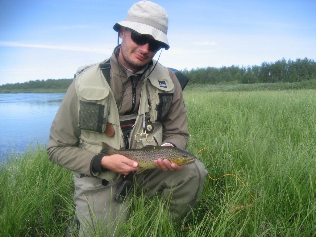 Jeg vælger at kigge nærmere på den side-å som jeg fiske i udløbet af dagen forinden. Der hvor helikopteren landede i går, kunne man komme opstrøms denne lille perle. Åen er ikke bredere end 2-3 meter, men utrolig flot med dybe huller og strøm ind under brinken osv. Jeg går får kæmpet mig ned til åen og går i gang med nymfen igen. Her er ikke nemt at komme til, men det lugter af gode fisk. På bagsiden af en lille ø i vandet er et mindre strømfyldt vand. Vanddybden er fra 10 til 50 cm. men midt i dette bliver min flue stoppet brat. En god lille kamp går i gang og kort efter kan jeg lande min første Lainio ørred. En flot en af slagsen. Fine røde pletter og ca. 30 cm. Jeg fisker videre i det stille vand og bagerst i poolen får jeg endnu et hug. Denne føles en del tungere, men jeg mister den dog efter ganske kort tid. Krogen må simpelthen hvad siddet for dårligt. Øv.
