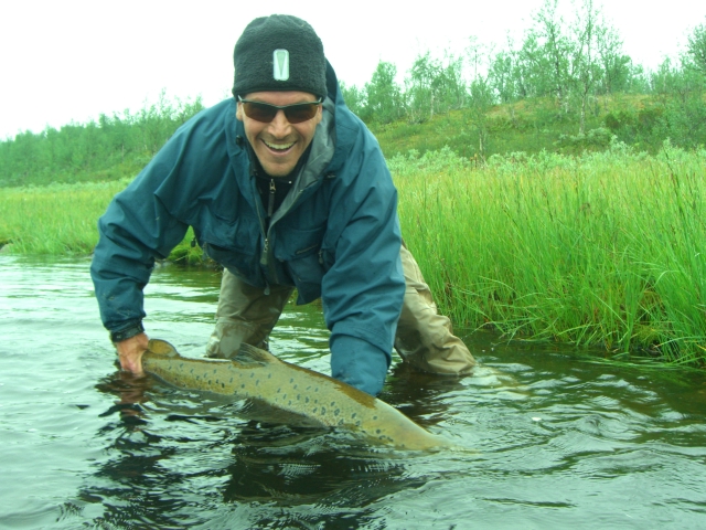 Jeg fisker videre ned af elven og når kun ca. 2 meter længere før jeg høre høje råb kommende opstrøms. Det er guiden Håkan der råber Laks! HC har efter bare 10 minutters fiskeri fået den første laks på krogen. Han er spinfisker og efter yderligere 10 min. fight landes en flot blank laks på 60 cm. Fisken bliver fotograferet og nænsomt genudsat. Dette bliver en rigtig god tur.