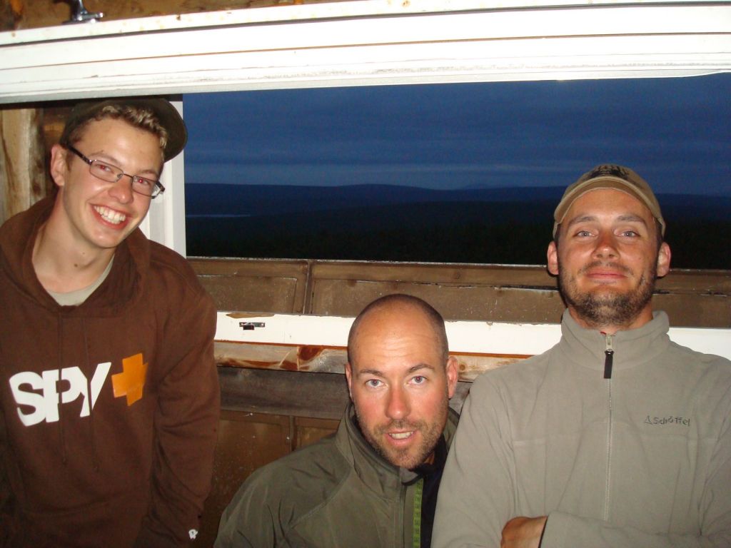 Sammen med Jesper aftaler vi at vandre op til udkigsposten som er på det nærvedliggende bjerg/bakke-top. Der er en 20 min. på gåben derop, men det skulle være det værd. Anders når lige akkurat at nå tilbage fra hans sidste tur, som desværre blev en nul-tur. Vi 3, samt guidelærlingen finder den lille skovvej op til udkigsposten og snart står vi et lille firkantet hus på toppen af 5 meter høje metalstolper og kigger ud over det nordlige sverige. Vi kan lainio elven der snor sig indbydene ud i landskabet. Vi kan se sne-klædte bjerge i det fjerne alt mens midnatssolen stadig holder himlen nogenlunde oplyst. En fantastisk sidste aften ved Lainio elven. I campen er det høje humør fundet frem. Folk har opdaget at der var et par ekstra pakker cigaretter skjult forskellige steder så der er tag selv bord. De sidste snacks, chokolade og øl bliver delt rundt til alle der ønsker og alle sidder og hygger sig rundt om bålet. Der bliver selvfølgelig fortalt flere lystfiskerhistorier og der bliver kigget billeder fra turen.