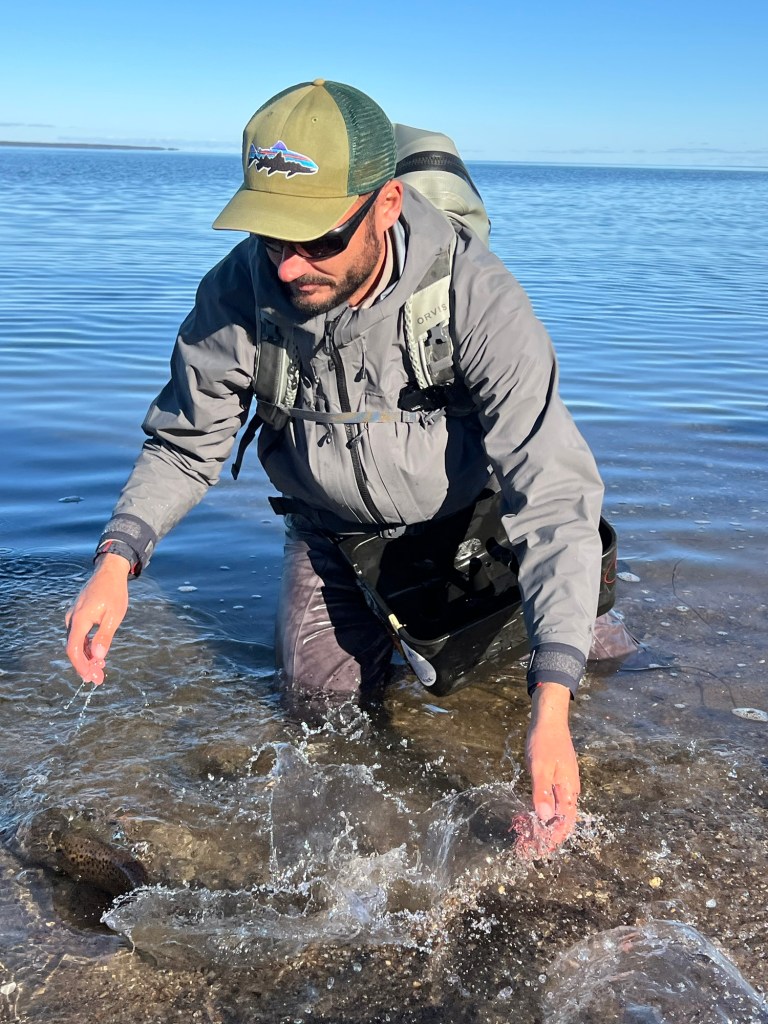 Peter sidder på en sten ikke mange meter væk og Morten er kun et par yderligere skridt væk. I fælleskab får vi en fed oplevelse med at få fisken i hånden, samtidig med at det hele blev ganske godt veldokumenteret. Den blev ikke målt – men skudt til at være lidt i omegnen af 50 cm.