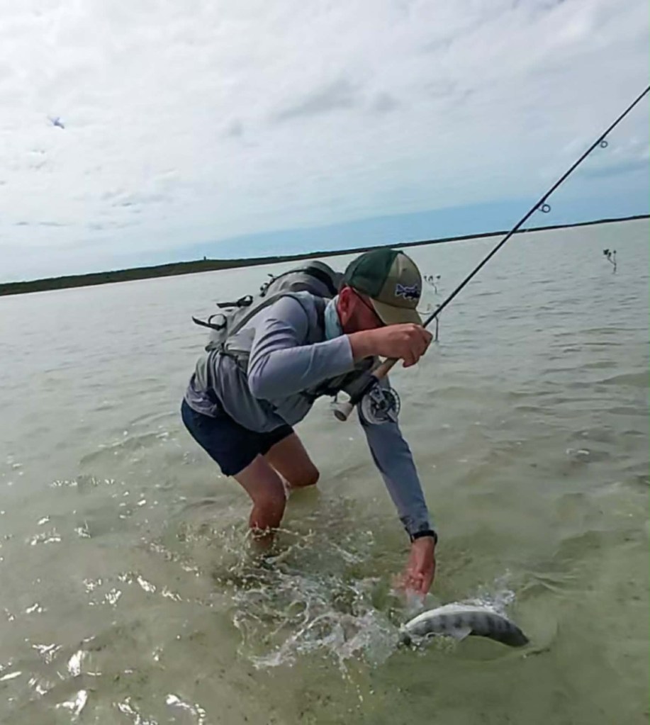 Vi hoppe i vandet og snart har vi en fin kæde kørende. Morten som er en helt eminent fluekaster, fisker og bone-fish spotter (samt et generelt fantastik menneske) er guld værd at have med på mit første forsøg. Fine instruktoner og det føles bare rart at gå i dejlig lunt vand med solen bagende ned på ens vinterkolde krop og langsomt blive varmet op til Bahamas temperaturer.