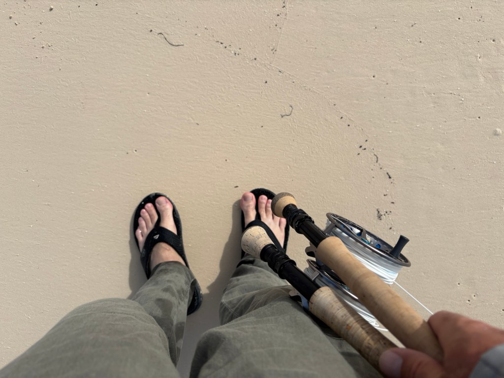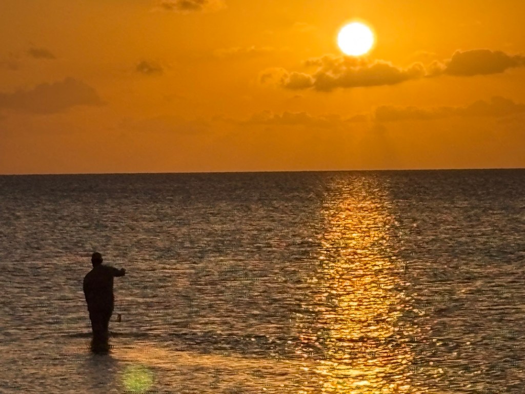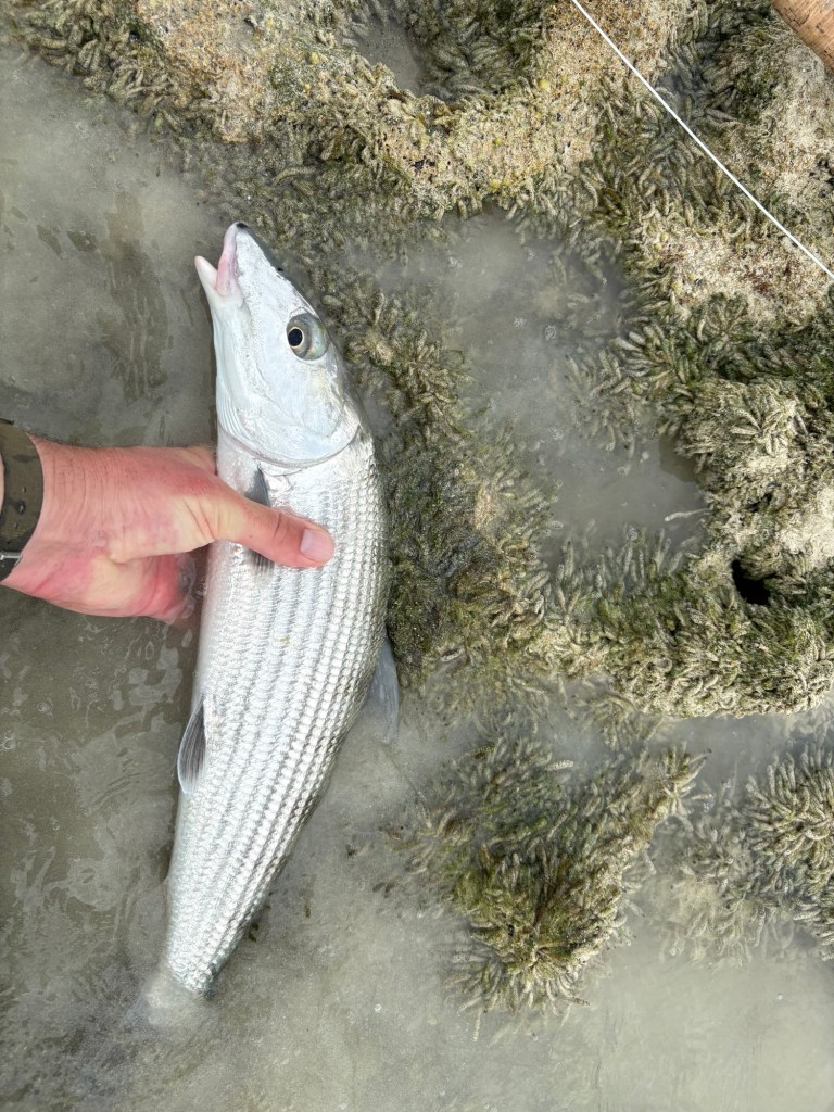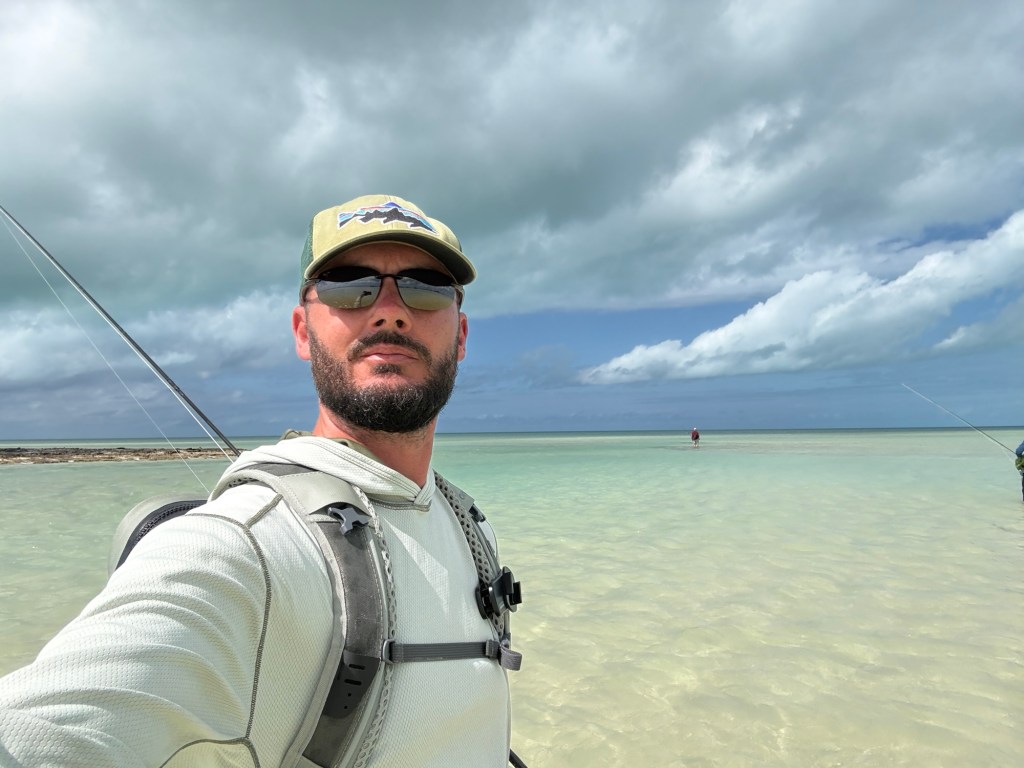 Når vejret er så stille så bliver fiskene selvføgelige også noget mere sky. Samtidig med at vi nemmere kan se gennem vandet så kan fiskene nok også nemmere se os. Så det er ikke nemt fiskeri men hamrende fedt. Jeg bliver spist op at sand-flies inden jeg kommer langt nok ud på vandet. Herefter bruger jeg en hel dag med at finpudse mine bone-fish ninja egenskaber.